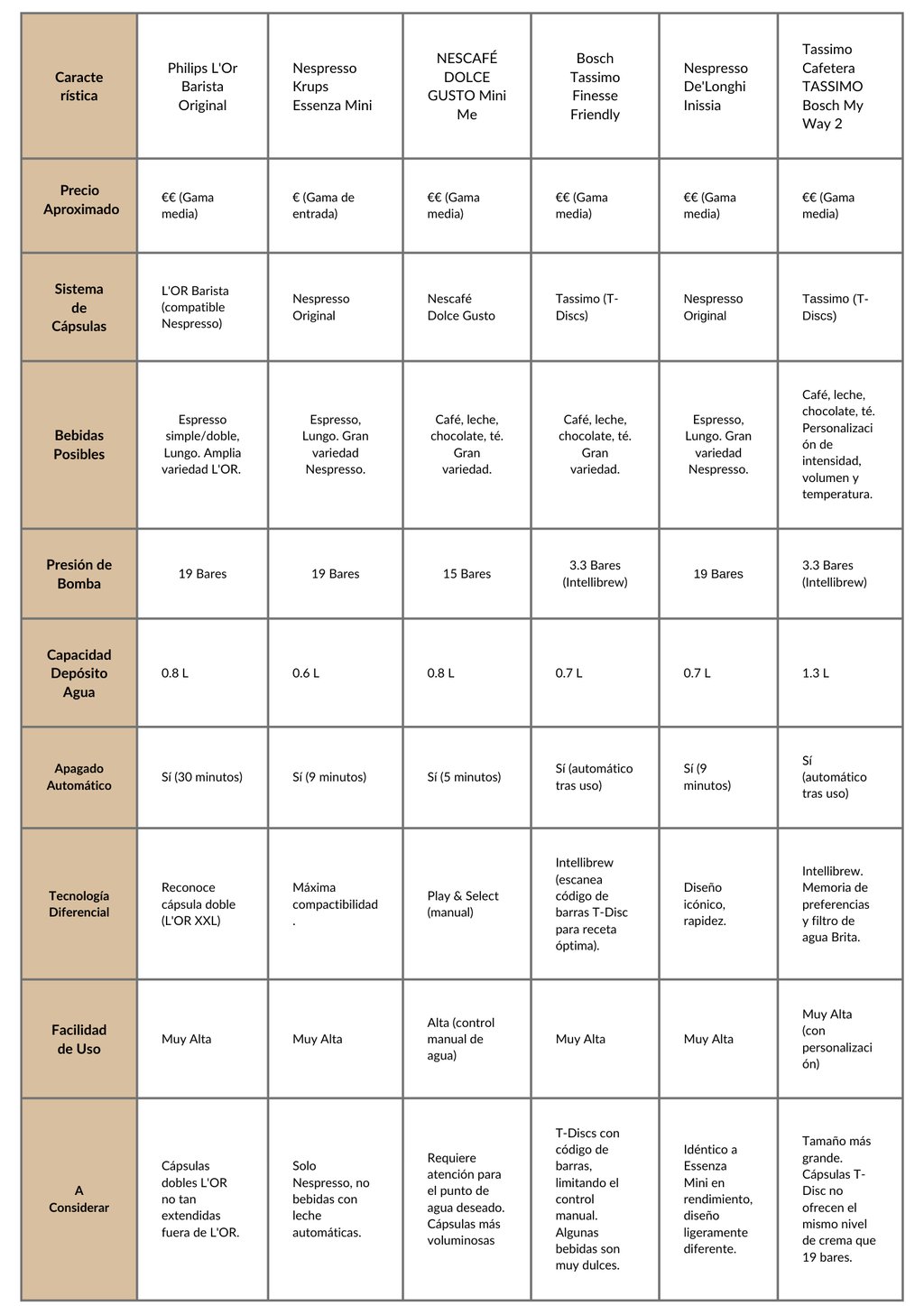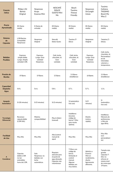 Philips L'Or Barista Original: Es una de las más vendidas porque representa la evolución del sistema de cápsulas. Su capacidad para hacer doble espresso y su compatibilidad con cápsulas Nespresso la hacen extremadamente atractiva. Ofrece la conveniencia de Nespresso pero con un extra de versatilidad y volumen, un "upgrade" popular para muchos usuarios.