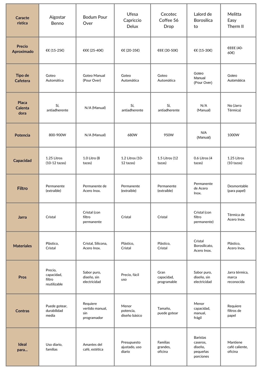 Para el día a día y presupuestos ajustados: La Aigostar Benno y la Ufesa Capriccio Delux son excelentes opciones. Ofrecen las funciones básicas necesarias para preparar café de forma rápida y sencilla, con buena capacidad y a un precio muy accesible. La Aigostar suele destacar por su filtro permanente y gran capacidad, mientras que la Ufesa es conocida por su sencillez y fiabilidad básica.