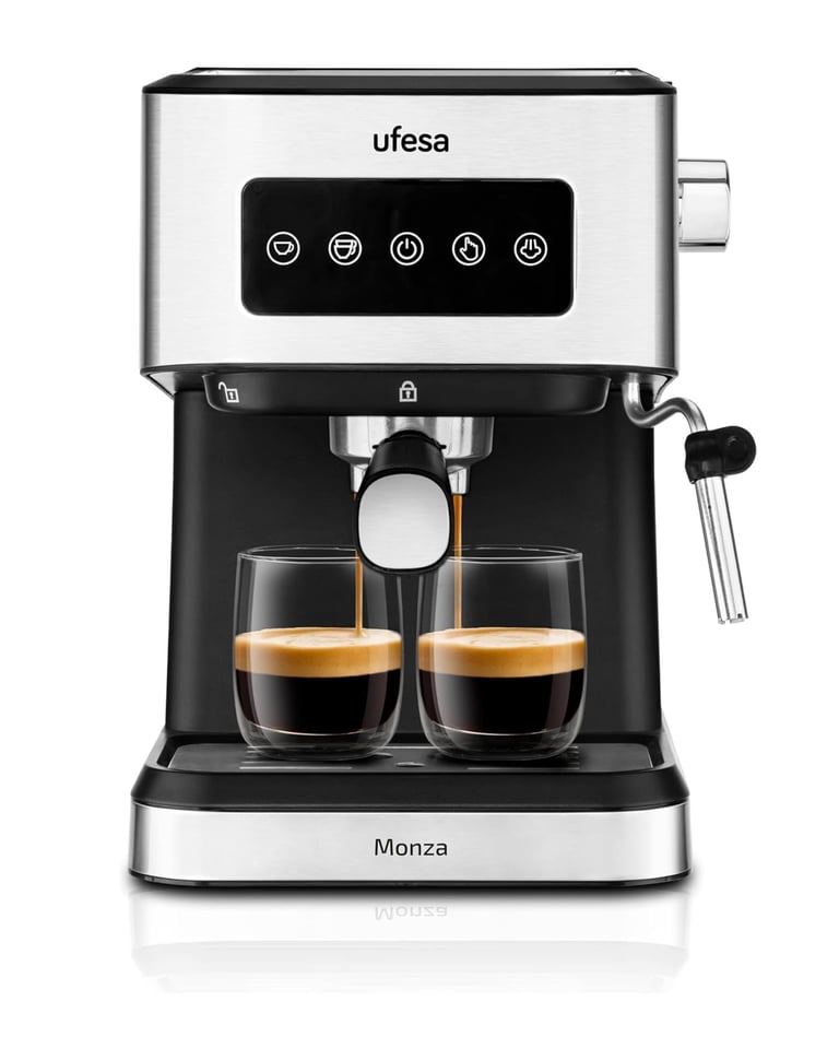Prepara espressos profesionales y cappuccinos perfectos con la Ufesa Monza, una cafetera de 20 bares de presión que extrae todo el aroma y crema de tu café favorito, ya sea molido o en monodosis ESE. Su panel táctil digital intuitivo ofrece control preciso con solo tocar un botón: selecciona 1 o 2 cafés, activa el vapor o usa la función calienta tazas para mantener el café a temperatura ideal.